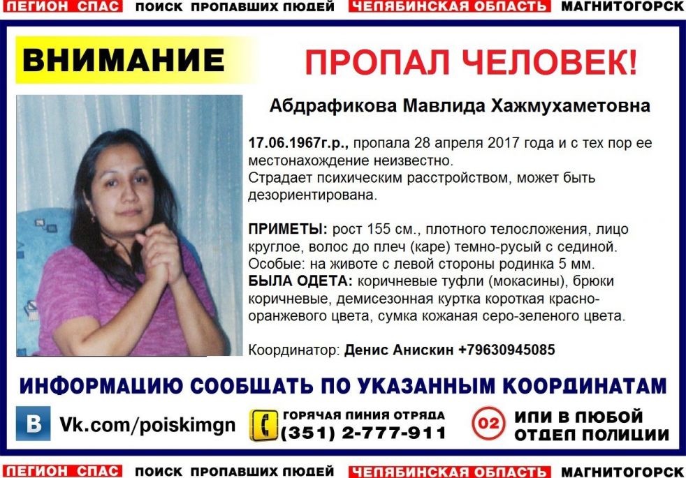 Легион-СПАС передаёт: Мавлида Абдрафикова вышла из дома 28 апреля этого года. С этого момента она не выходила на связь. Где она находится, неизвестно.