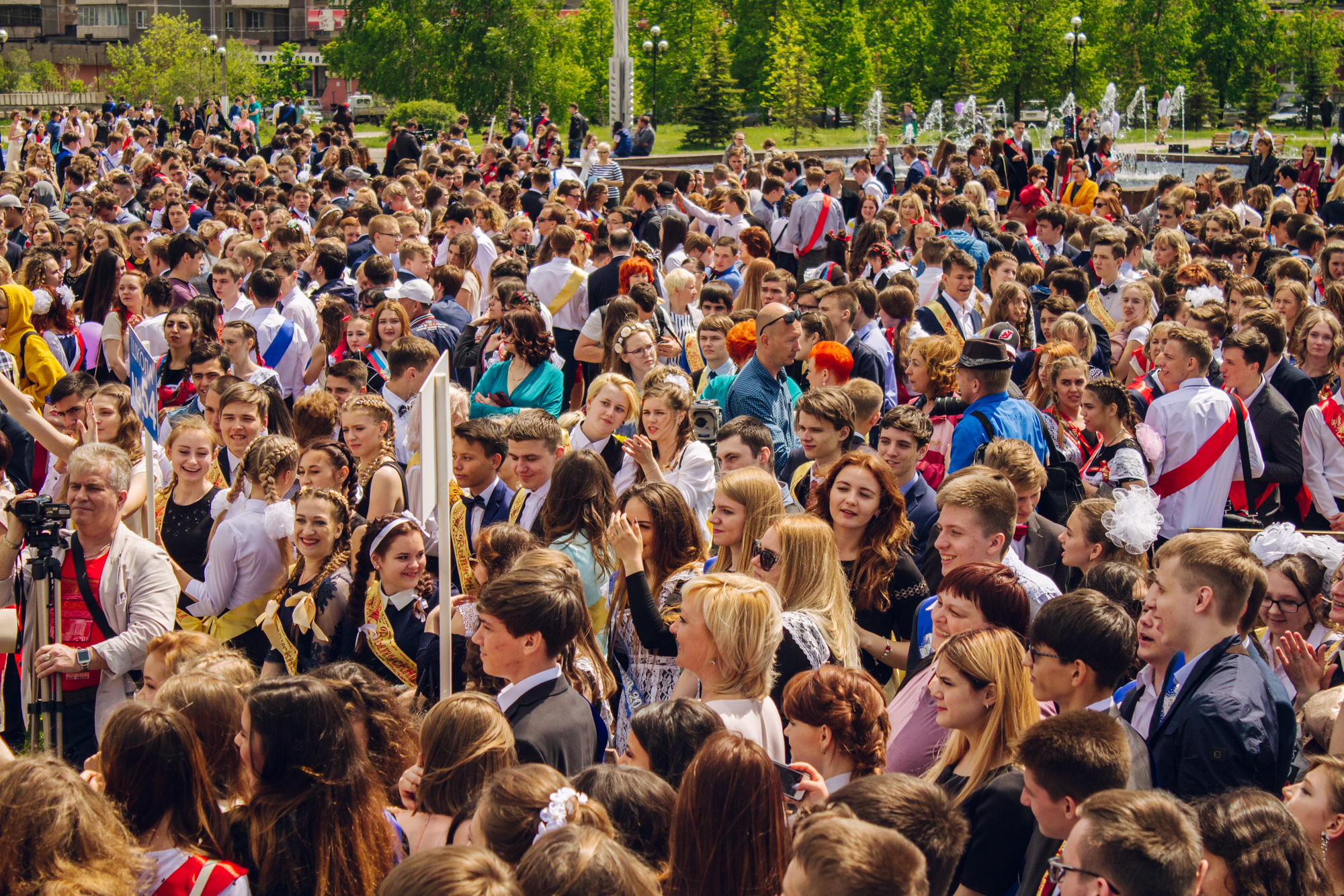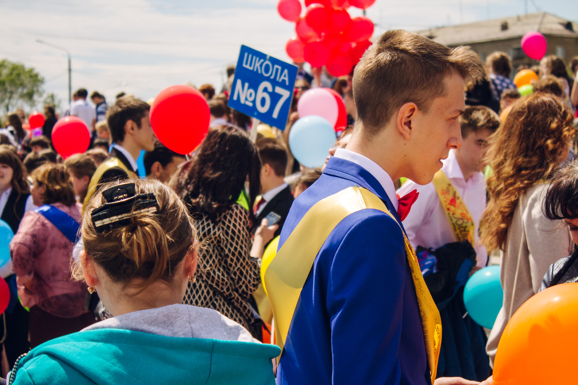 Школьников собирают учителя и люди из управления образования. Порядок победил хаос. Все собрались под табличками с номерами учебных заведений. Со сцены командуют: в путь. Начался «Парад выпускников».