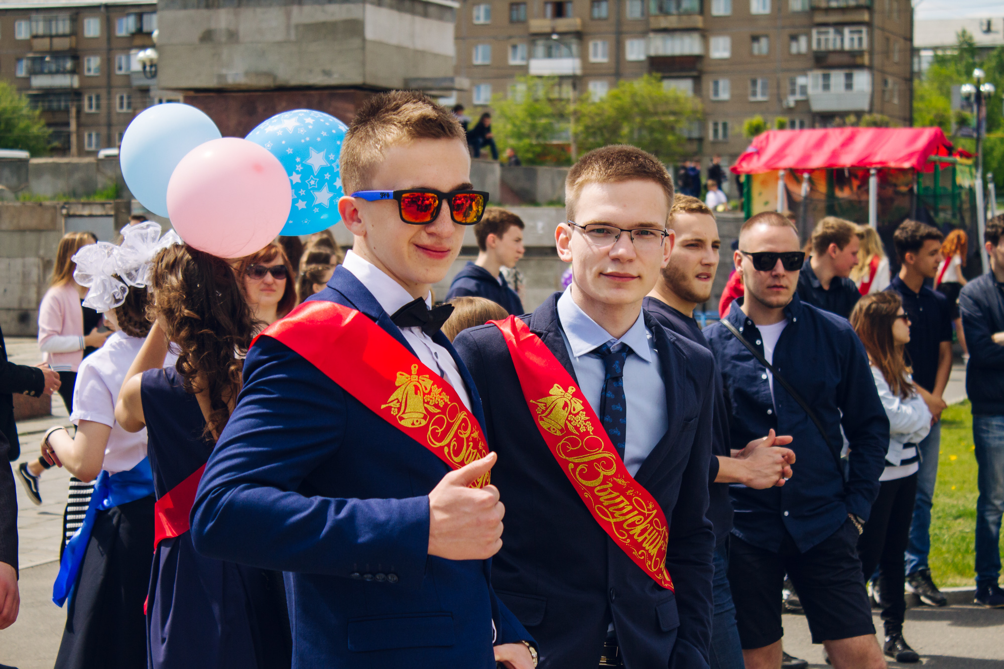 Неподалёку от фонтана стоят два приятеля, Артём и Сергей. Отдельно от остальной массы. Общаются, смеются. Говорят: сегодня для них самый радостный день.