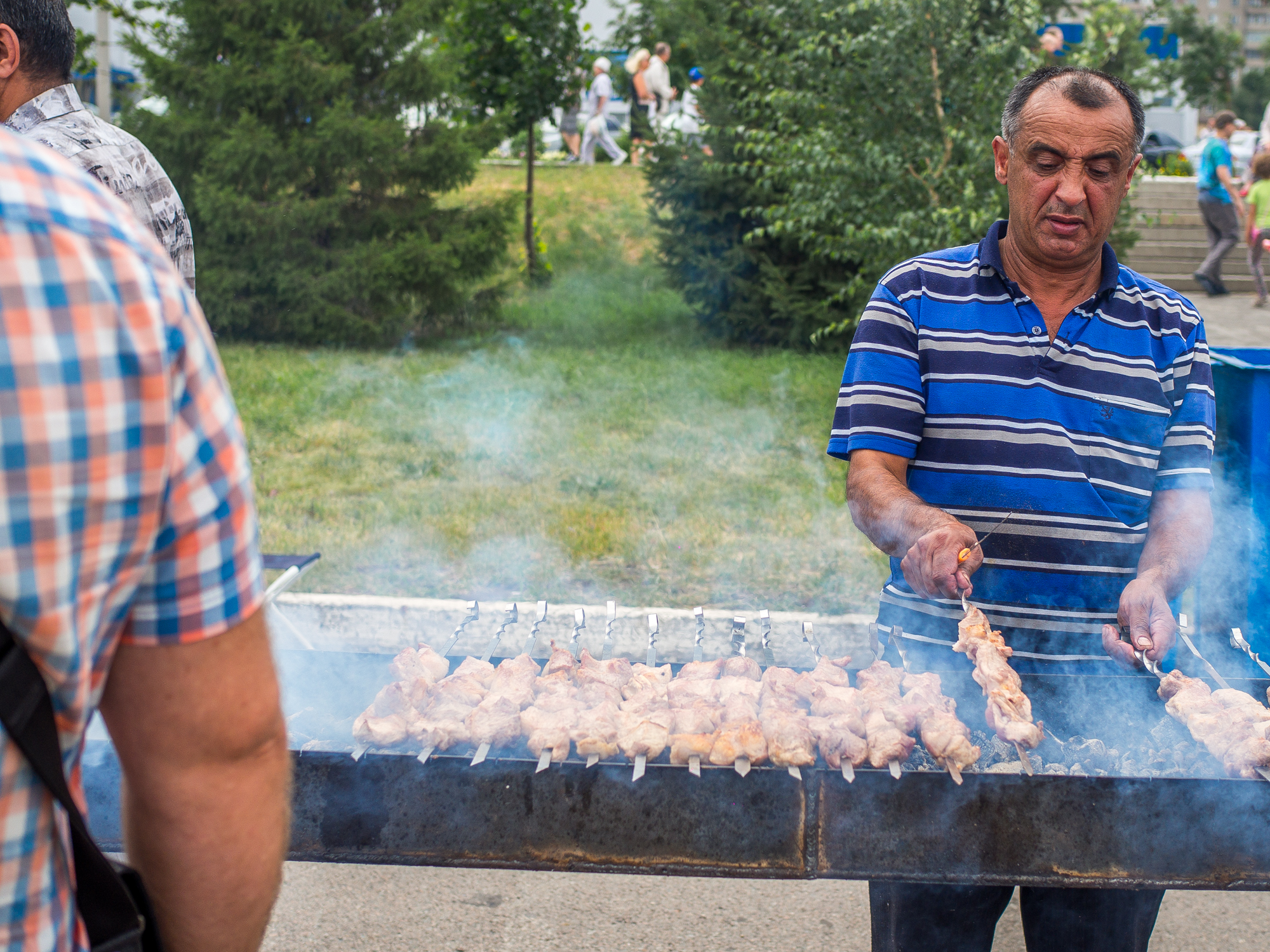 На сцене пусто. Зато работа кипит в палатках с едой. В меню то, что и несколько лет назад: пирожок, шашлык, пенный напиток. Горожане рады и такому гастрономическому предложению. Некоторые уже не могут держать себя в руках.