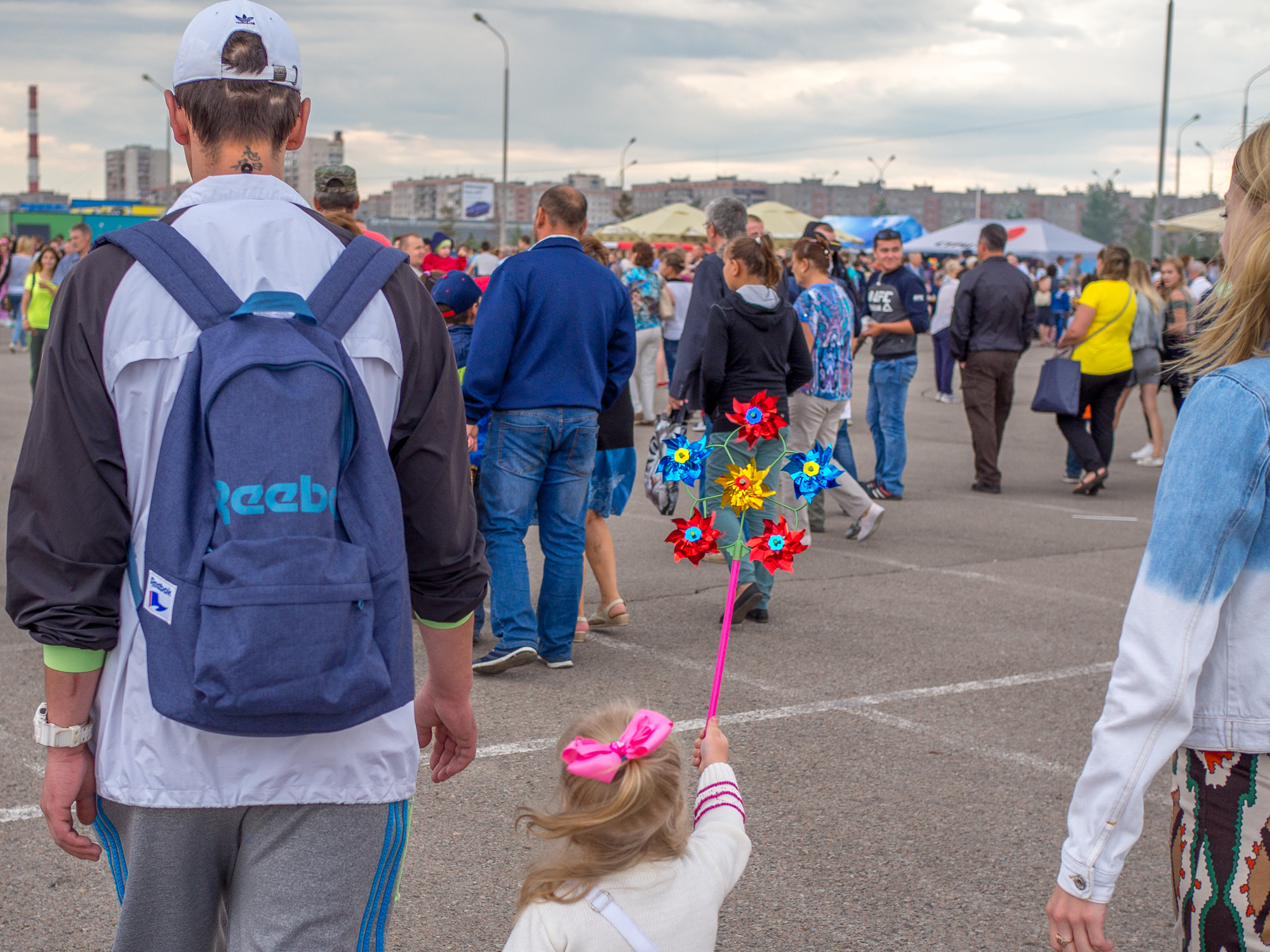 В пять часов по перекрытому проспекту Ленина движутся толпы. Самая большая людская цепочка тянется со стороны Советской армии. Понять, что праздник в разгаре, легко. Уже на перекрёстках предлагают купить флаги, шарики, светящиеся палки и мыльные пузыри.