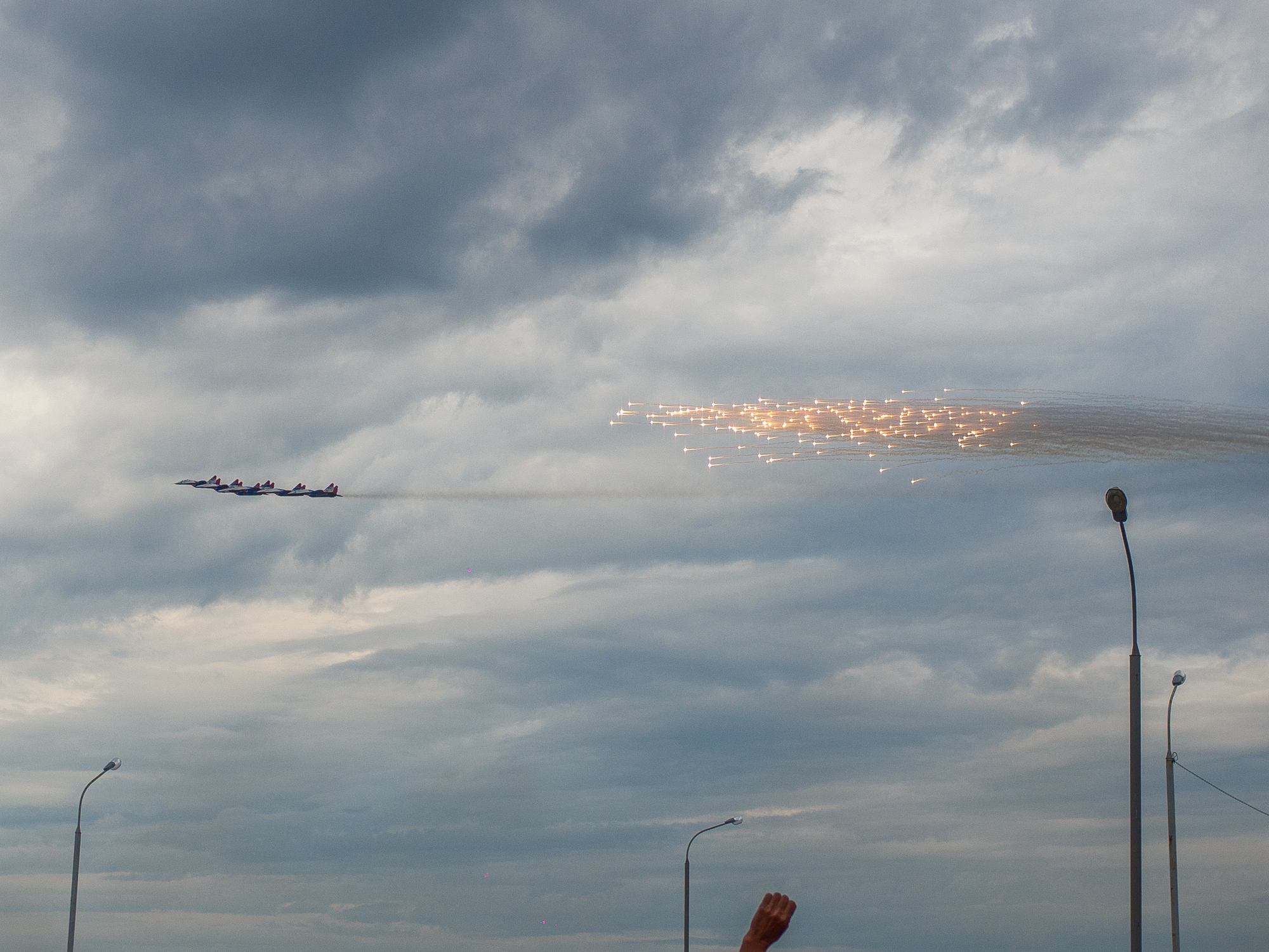 Шестёрка «МиГов» появляется через сорок секунд. Летят справа, от собора. Над толпой сбрасывают пиротехнику — приветствуют горожан. И уходят на разворот.