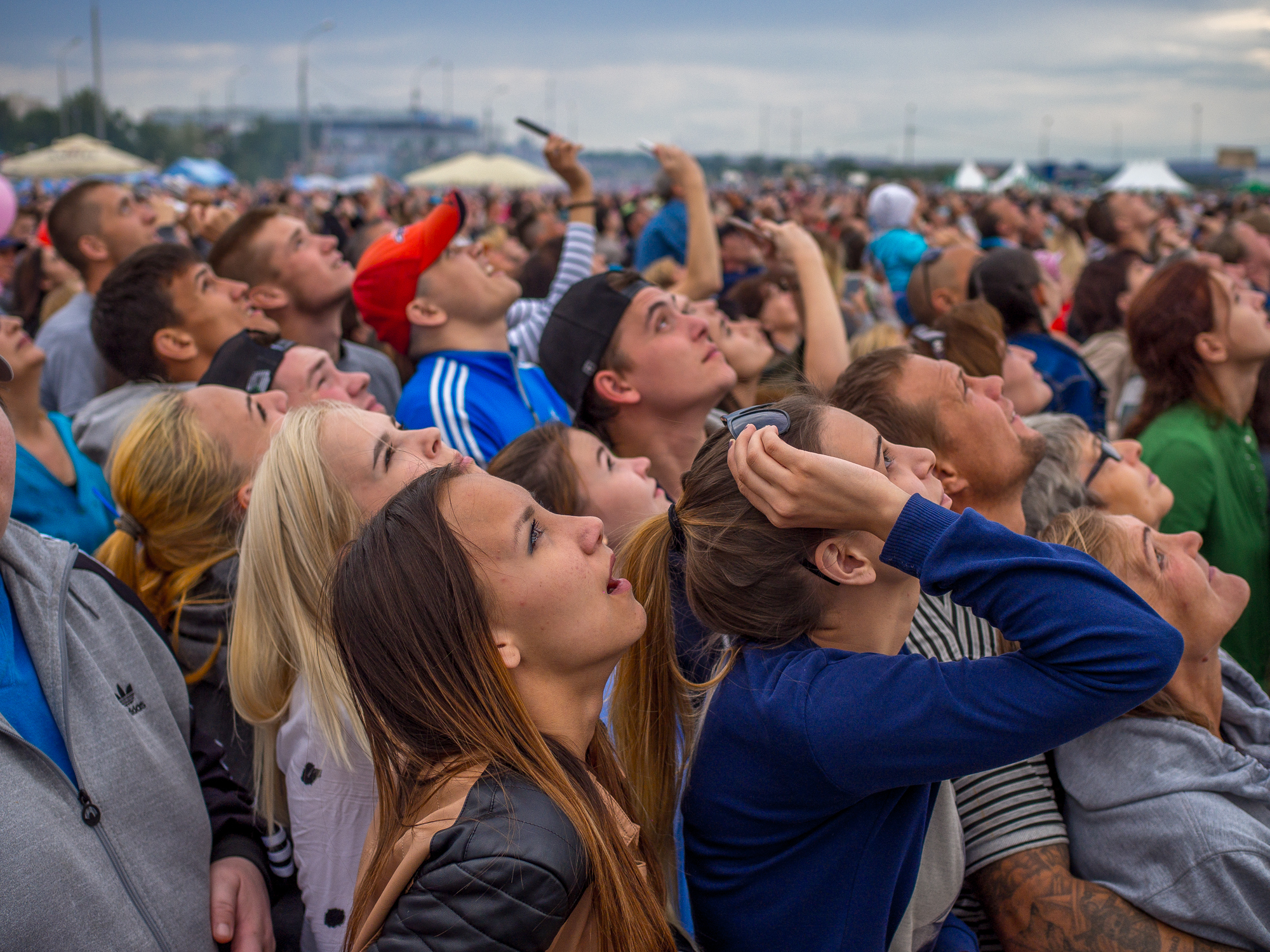К семи часам люди заполнили всю территорию праздника. Одни пытались найти место повыше: встали в три ряда у Дворца спорта имени Ивана Ромазана. Другие наблюдали с улиц. Казалось, будто все бросили машины для того, чтобы поднять голову к небу.