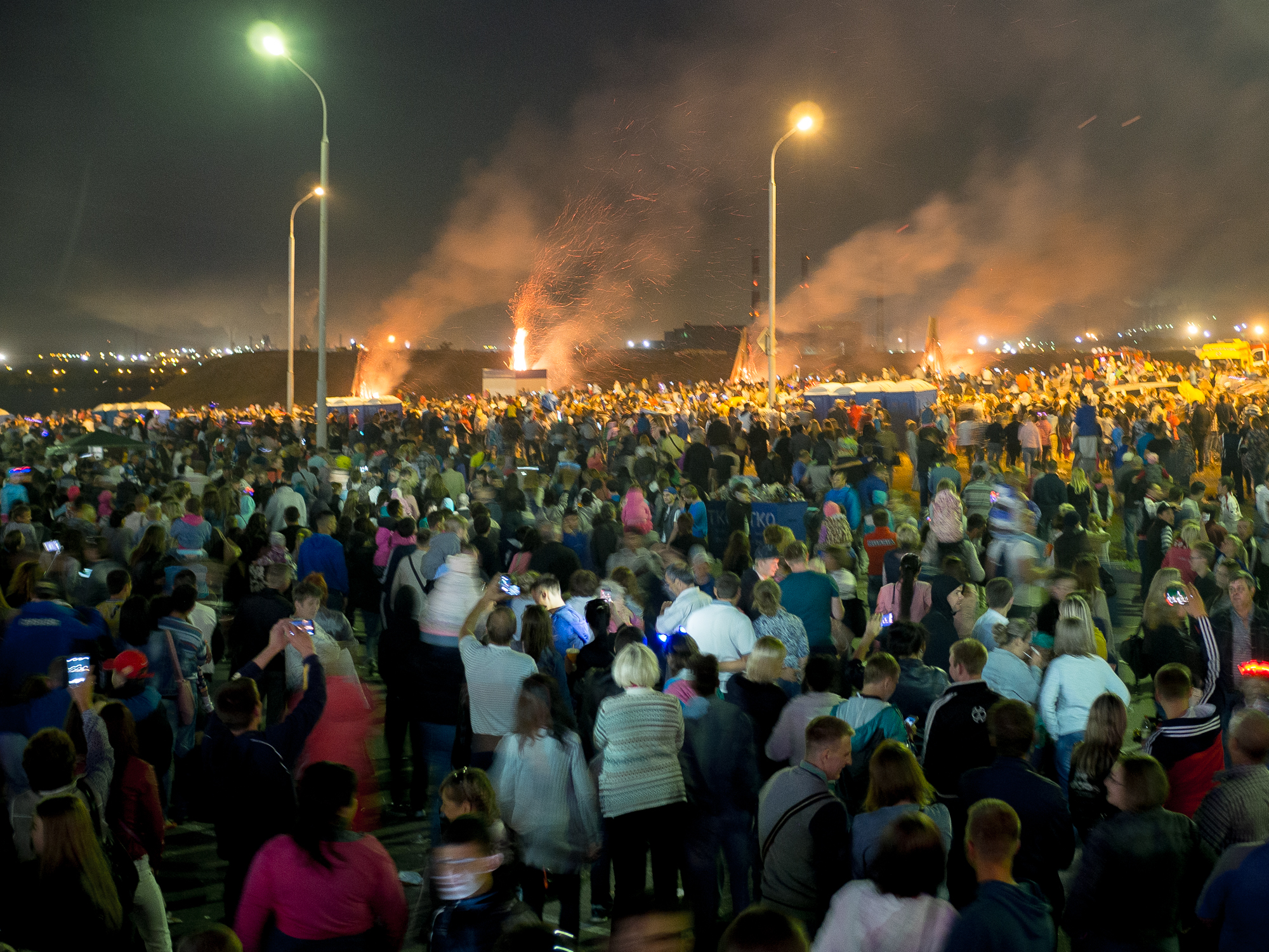 Спонтанно зажигаются «Золотые костры». К ним людей не подпускают — выстроили живое заграждение из полицейских. Дежурят пожарные. Со сцены про костры молчат. Они просто горят — красиво.