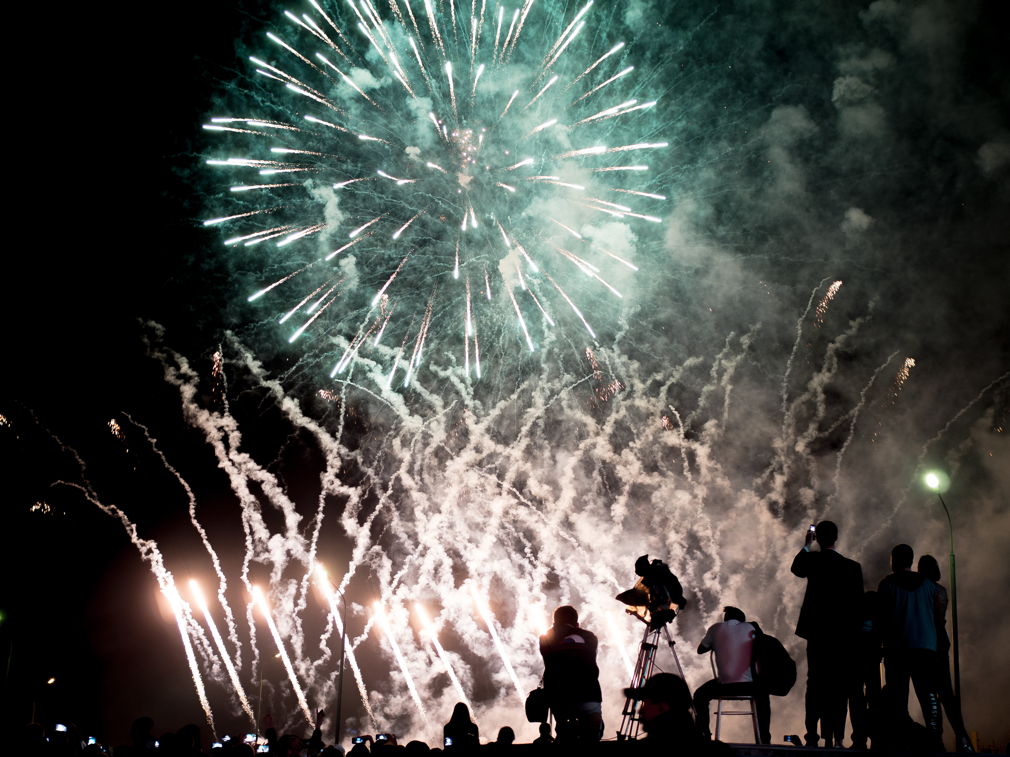 Возвращаемся на место. Ещё несколько минут, и также без предупреждения — грохот в небе. Ввысь летят жёлтые, красные, синие искры. Дойдя до определённой точки, раскрываются в окружность. Иные летят, как маленькие кометы, со страшным писком.