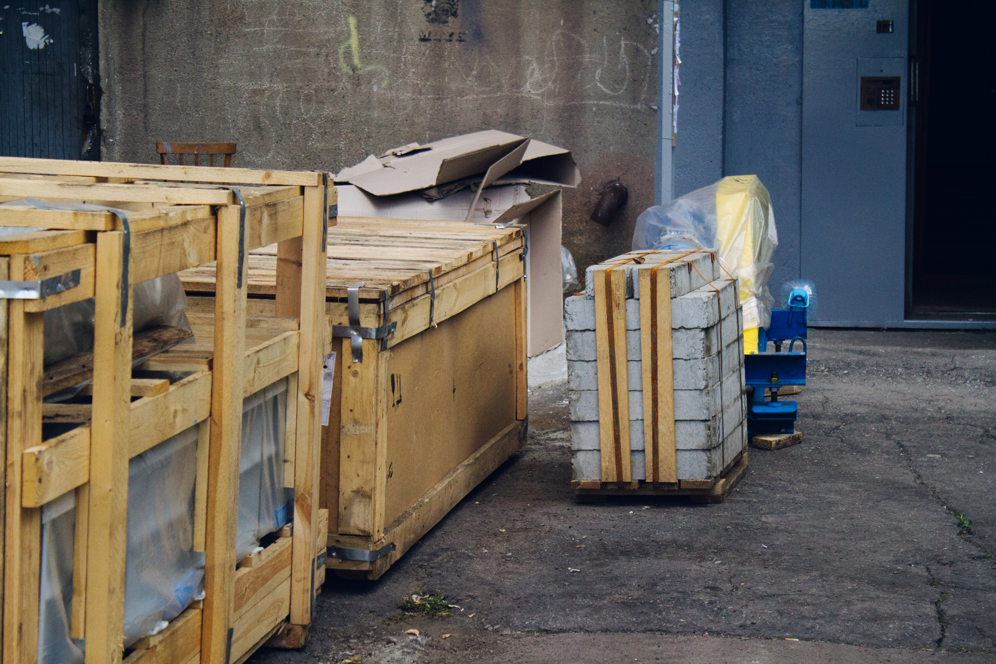 Возле подъездов дома на Ленина, 80 штабелями лежат бетонные блоки, коробки, ящики. В деревянных каркасах ждут установки двери и железные обрамления для проёмов. Лифтёры их называют дверными «порталами».