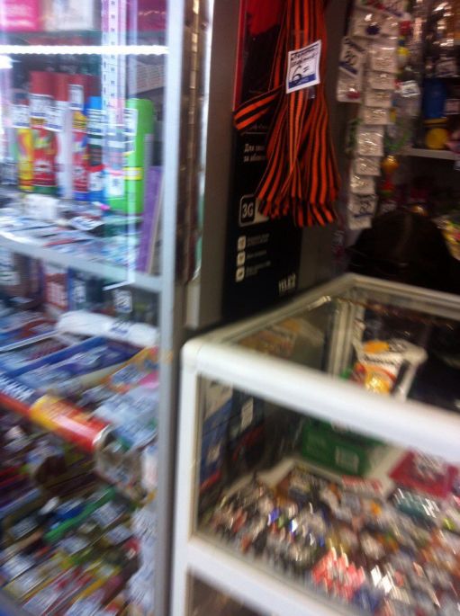 Ленты продавали в том же здании, где находится сетевой продуктовый супермаркет. Отметим, что Георгиевские ленточки действительно раздаются бесплатно. В преддверии 9 мая волонтеры и активисты раздают ленточки на площадях и оживленных проспектах города в период с 5 по 8 мая.