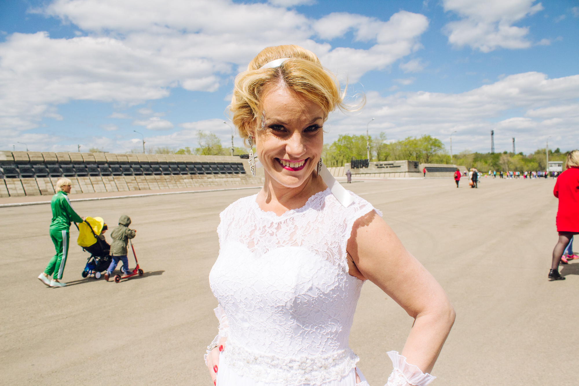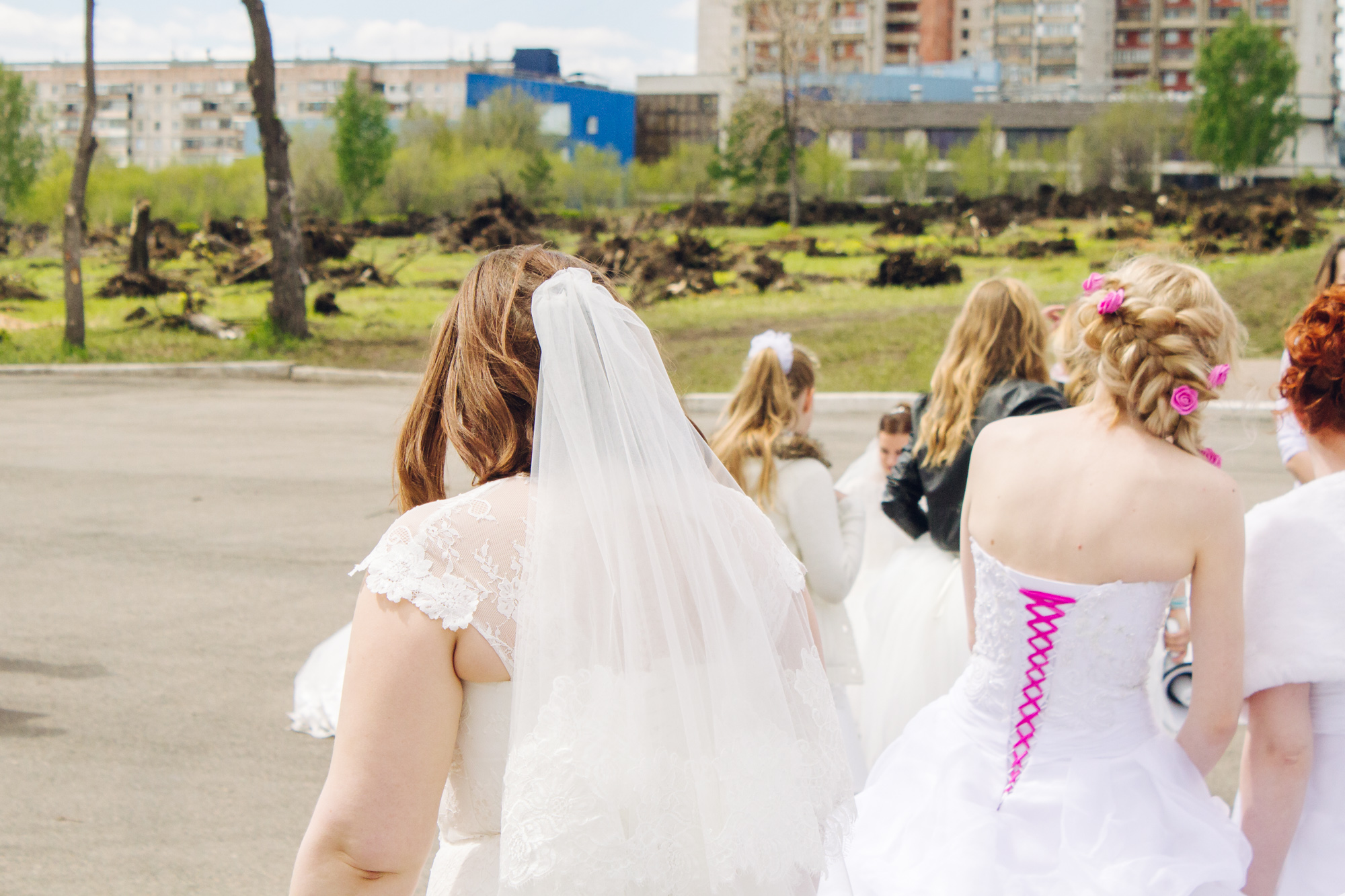 Невесты собрались накануне, напротив администрации. Путь предстоял несложный— от проспекта Ленина к Тыл-Фронту. Идти не торопились. Несколько раз выстраивались на общее фото, ждали опоздавших и вновь готовились к съёмке.
