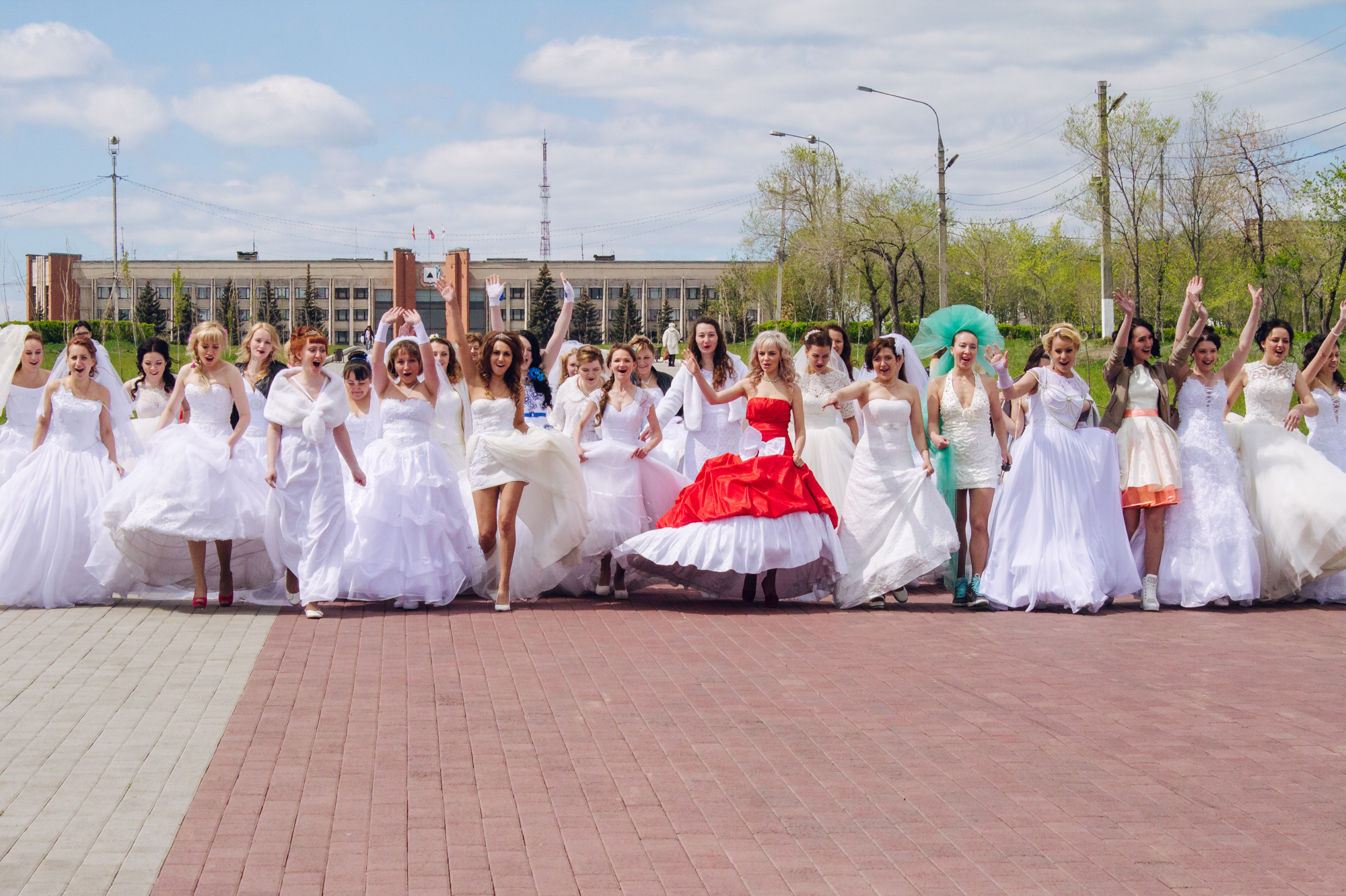 Девушкам разрешили «выдохнуть». Позвали фотографироваться. Всего на площадь к Тыл-Фронту пришли 35 невест.