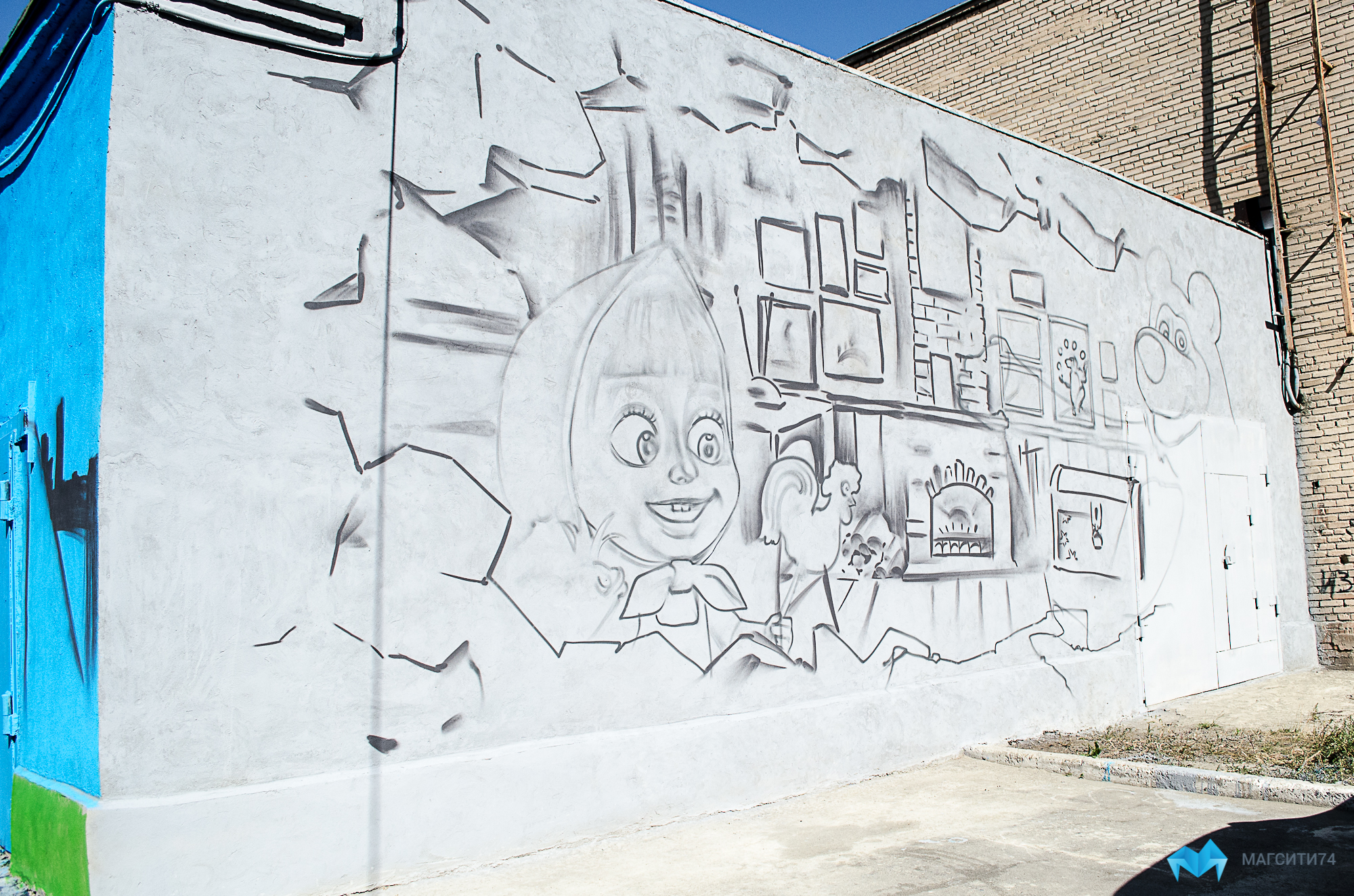 Тематический рисунок сделала команда граффити «Личное время». В мире стрит-арта уличные художники известны как Вирус и Бразилец. Павел Дериглазов родом из Магнитогорска. Тимур Абдуллаев из Челябинска, но некоторое время жил в Бразилии. Над созданием масштабной картины мастера трудятся на протяжении четырех дней. Высота кирпичного полотна — 4 м, длина — 60 м. Чтобы разрисовать стену площадью 200 кв. м, молодым людям понадобилось более 150 баллонов с краской.