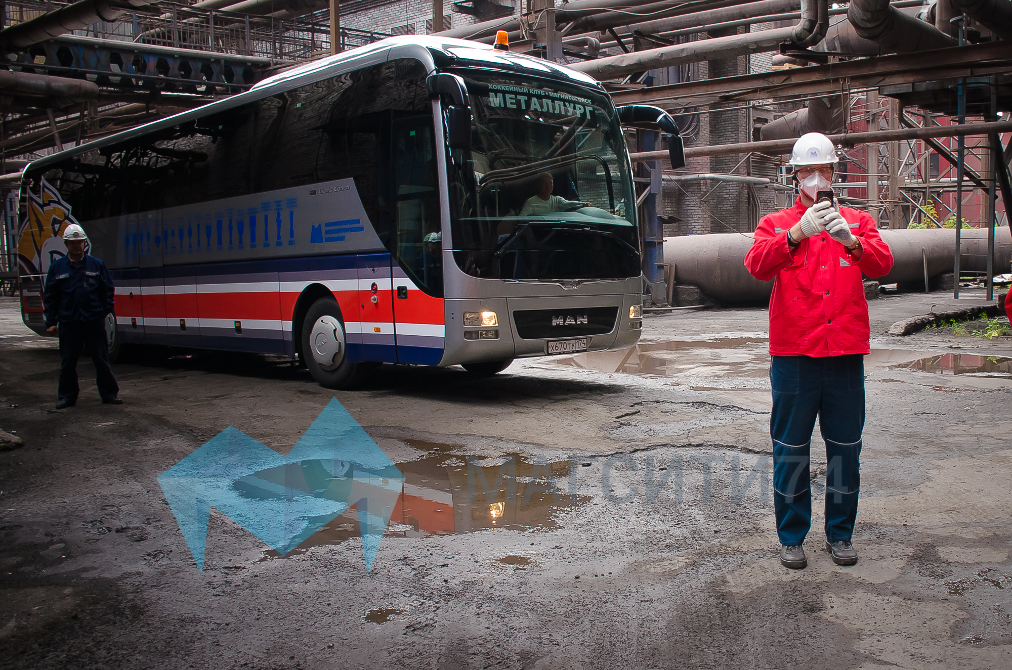 Экскурсия по комбинату началась прямо в автобусе. Спортсменам рассказали, почему промышленный гигант возвели у подножия горы Магнитной, как в тылу предприятие обеспечивало фронт, и что каждый второй танк и третий снаряд были сделаны из магнитогорской стали.