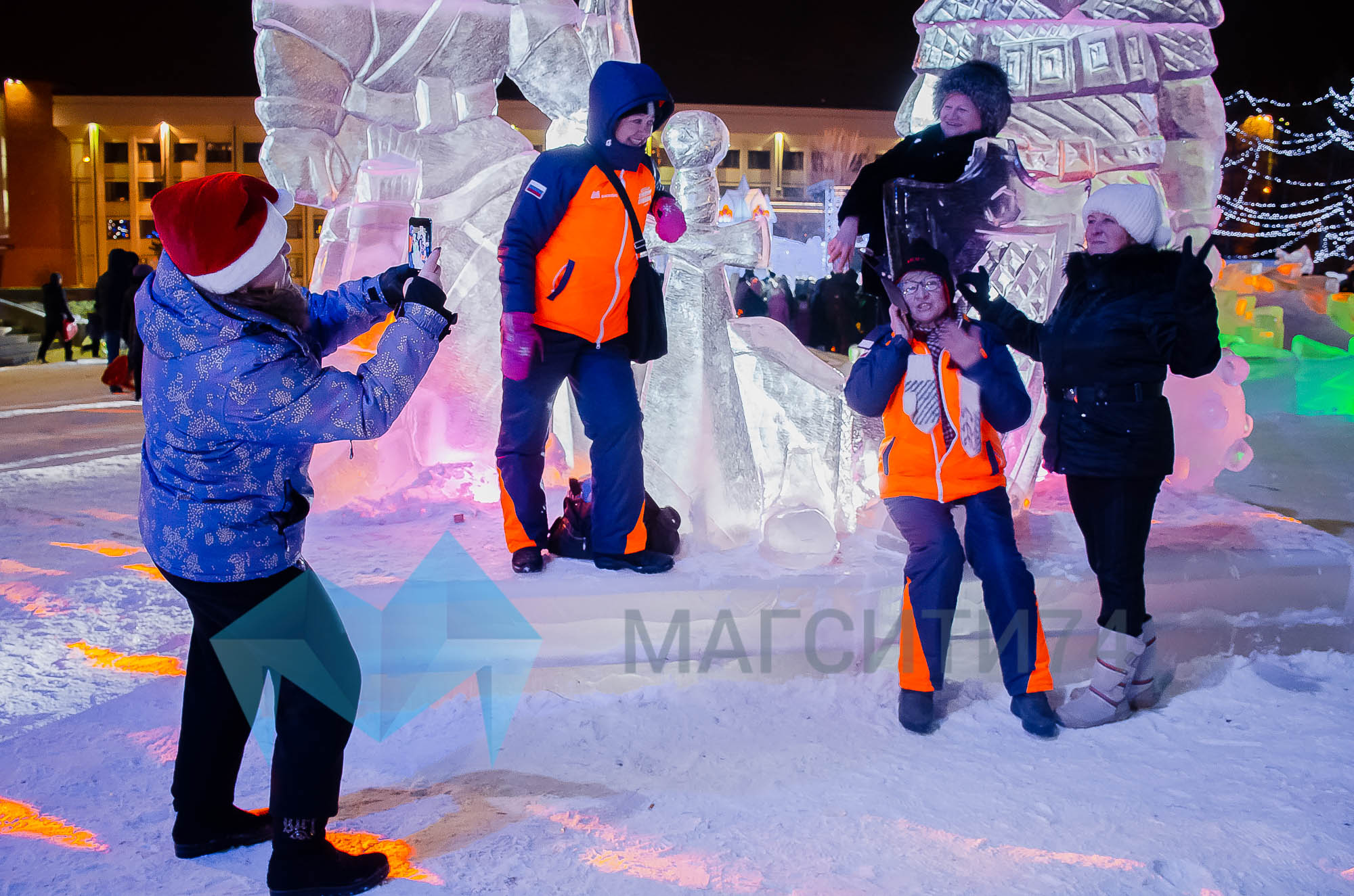 В этот вечер развлекаются и серебряные волонтеры: радостно фотографируются у ледяных фигур. На елку приехали специально.