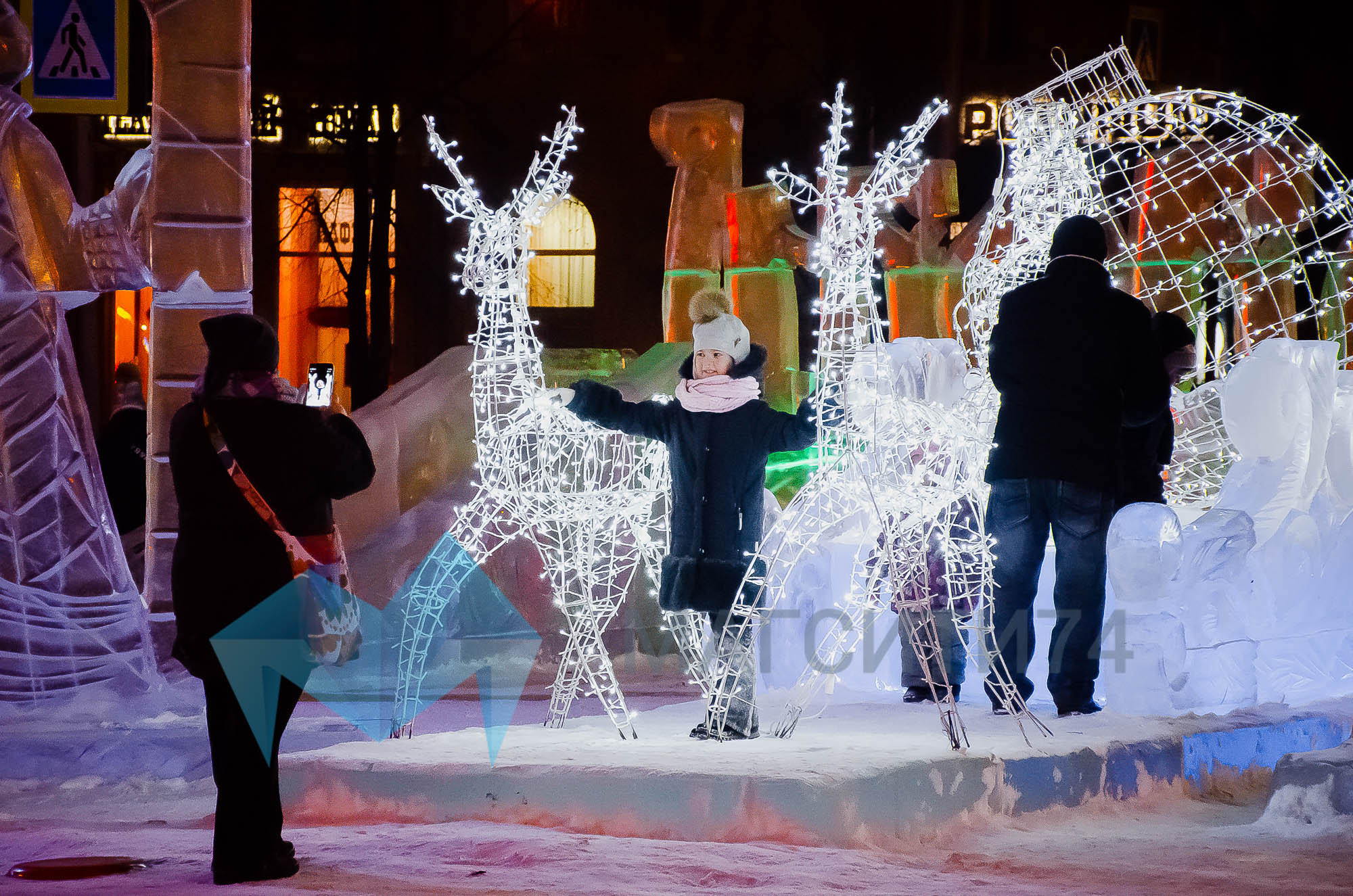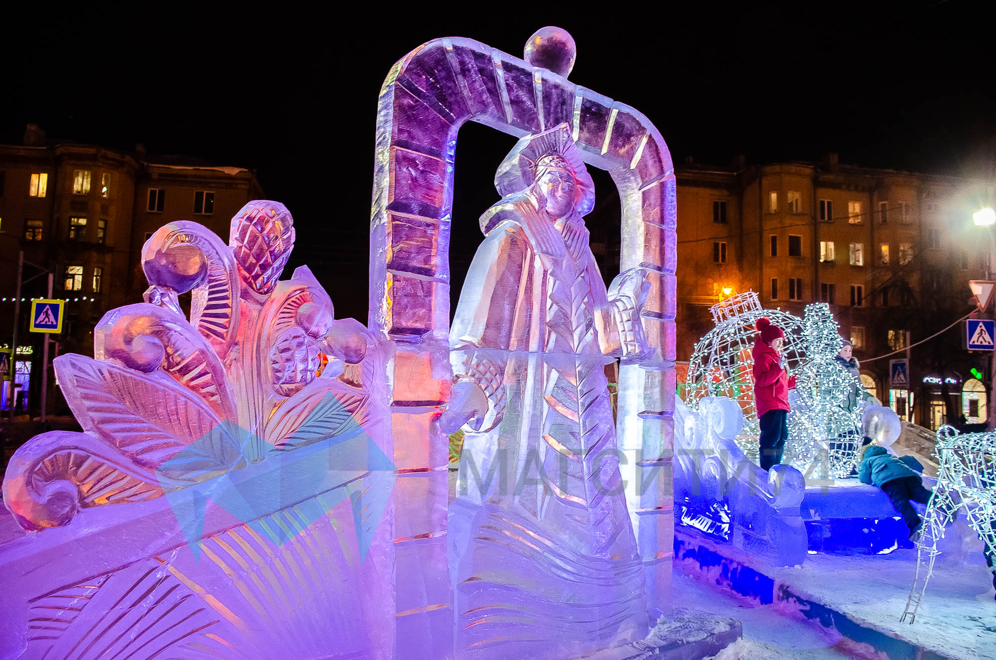 На территории городка расположились ледяные фигуры Антошки, Мамонтенка, белогривых лошадок, белых корабликов. А детвору развлекали Пчелка, Медведь, Снеговик и Баба Яга.