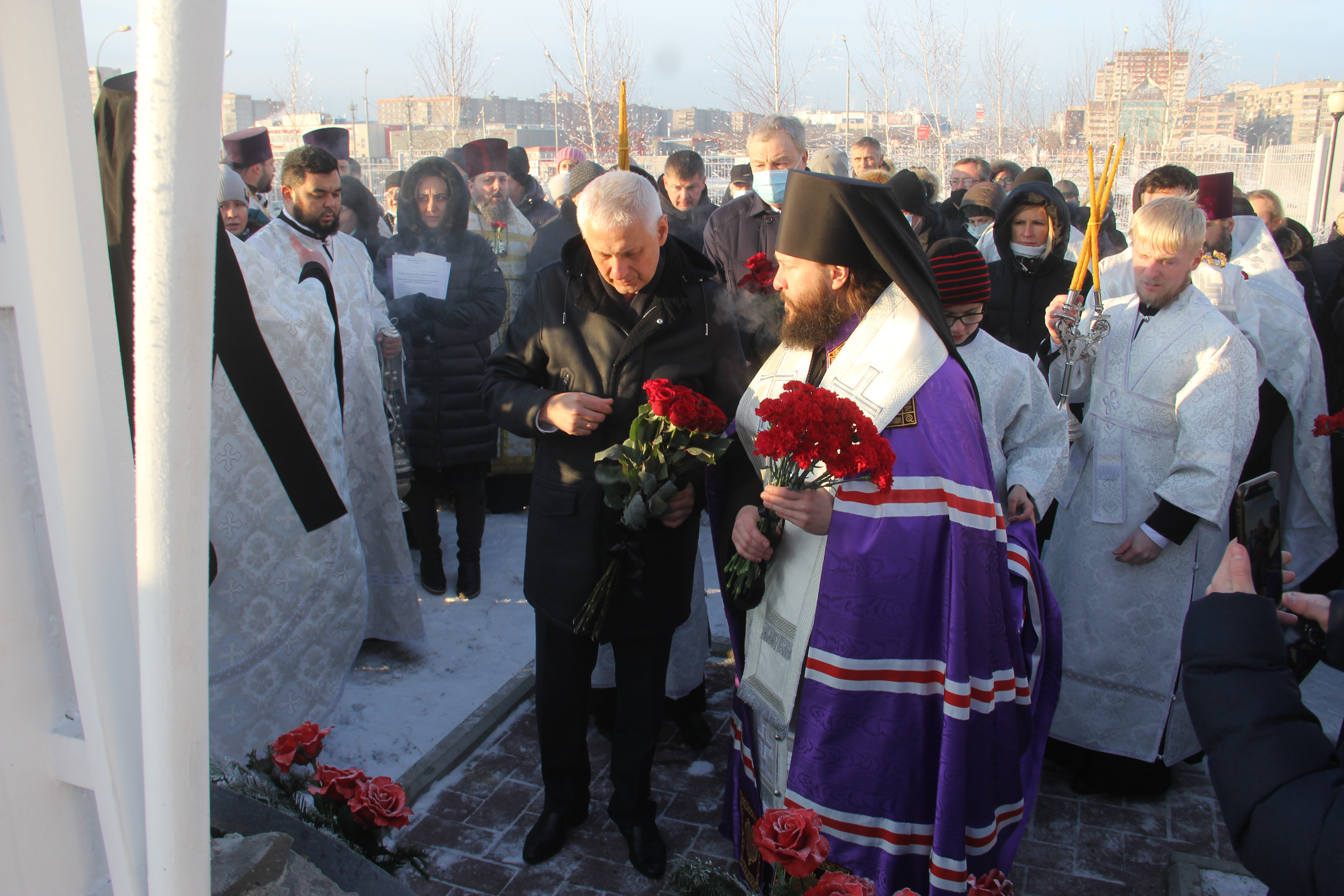 Сегодня в Кафедральном соборе Вознесения Христова прошли Божественная литургия и панихида. После ее окончания на территории собора был совершен чин освящения поклонного креста в память о жертвах магнитогорской трагедии.