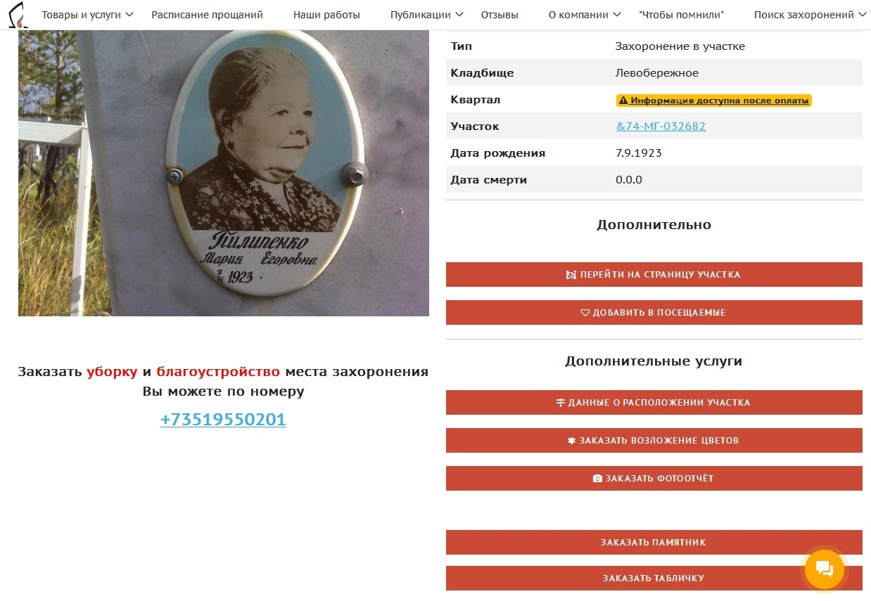 Затем в разделе «Поиск захоронения» ввести имя умершего. После на его страничке появятся поля с предлагаемыми услугами. В зависимости от того, что именно вы хотите, тот раздел и выбираете.