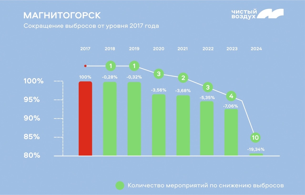 Ранее предполагалось, что к 2024 году в Магнитогорске будет снижен совокупный объем выбросов в атмосферный воздух на 47,78 тыс. тонн. Это 22,88% от уровня 2017 года. Снижение совокупного объема выбросов опасных загрязняющих веществ также к 2024 году должно составить 0,26 тыс. тонн. Это 0,13% уровня 2017 года. По финансированию это порядка 29 млрд рублей, в том числе за счёт средств федерального бюджета 5,7 млрд рублей.