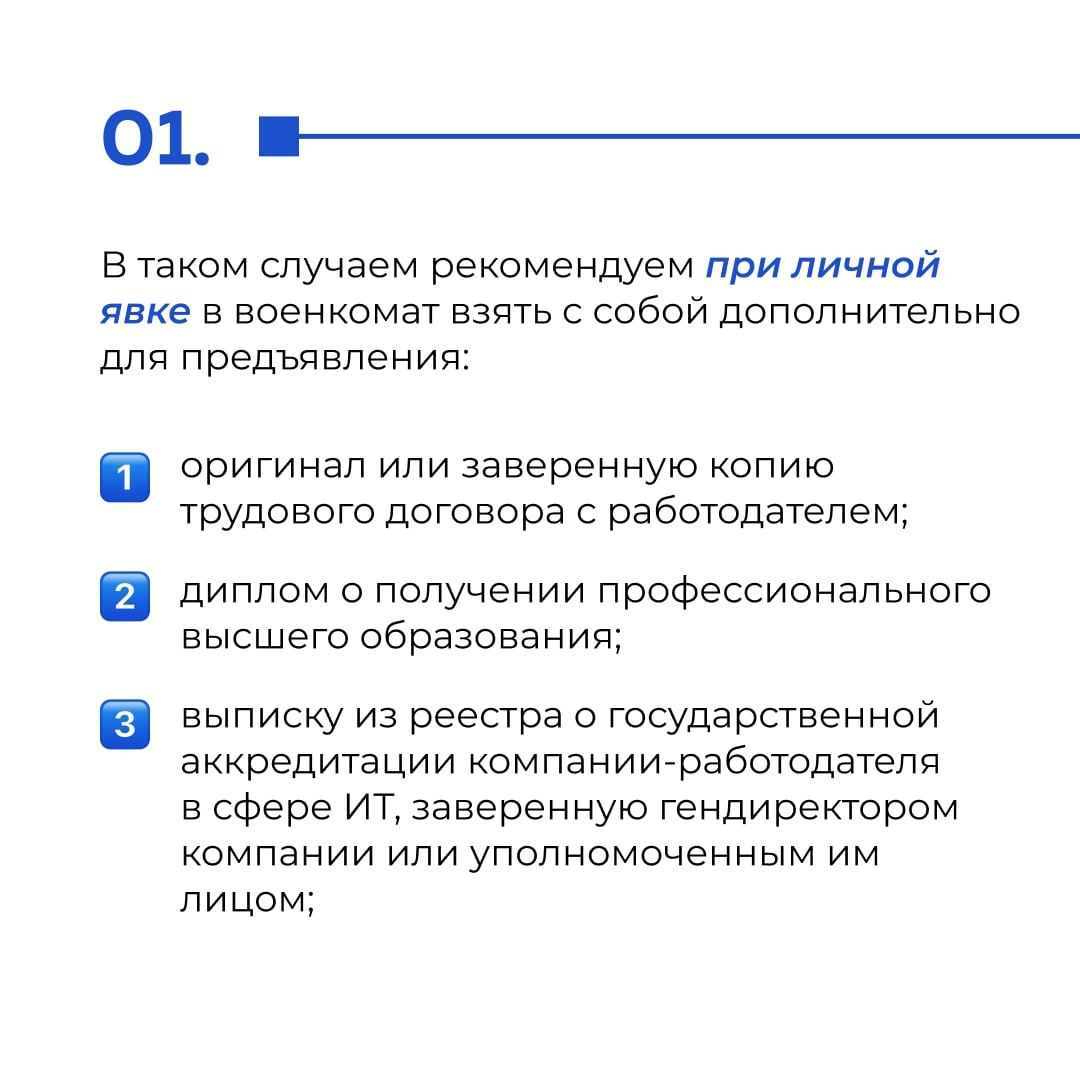 Сегодня стало известно, что сотрудники определённых компаний получили отсрочку от призыва по мобилизации. В Минцифры подготовили памятку для таких специалистов о том, как вести себя в военкомате.