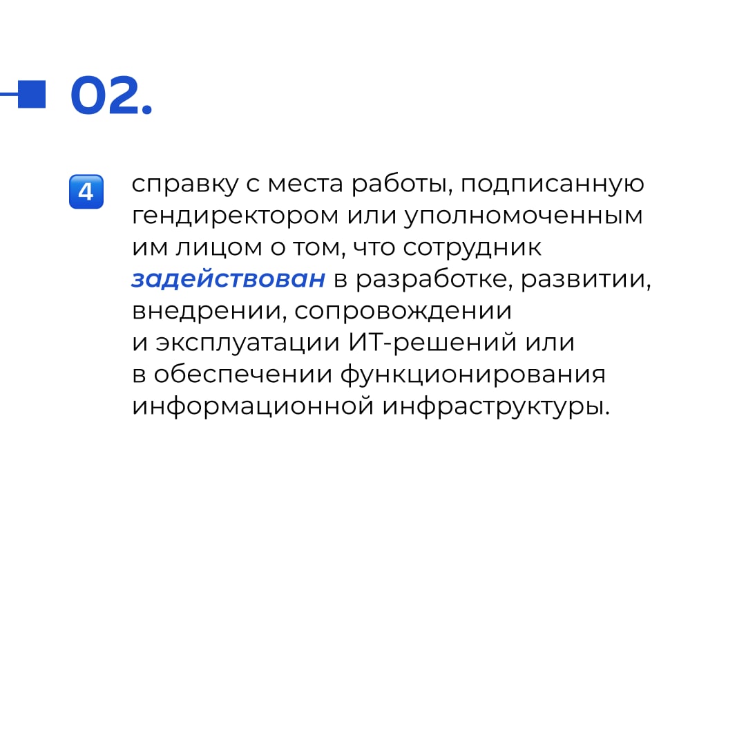 4) справку с места работы, подписанную гендиректором или уполномоченным им лицом о том, что сотрудник задействован в разработке, развитии, внедрении, сопровождении и эксплуатации ИТ-решений или в обеспечении функционирования информационной инфраструктуры.