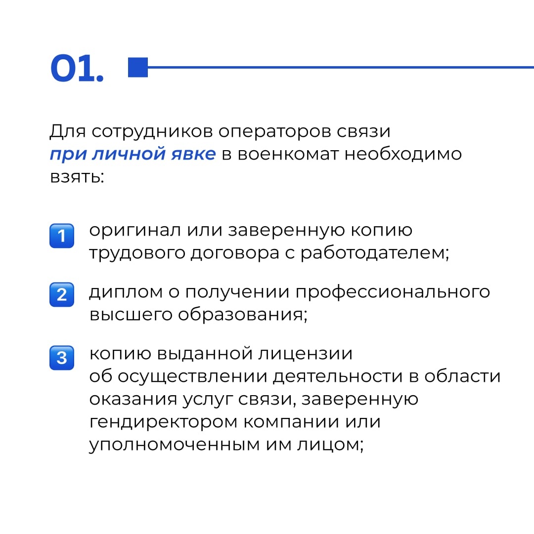 Сотрудникам системообразующей организации в сфере информации и связи (включая СМИ, радиовещателей и телевещателей), соответствующий требованиям отсрочки и получивший повестку, при личной явке в военкомат рекомендуют взять с собой: