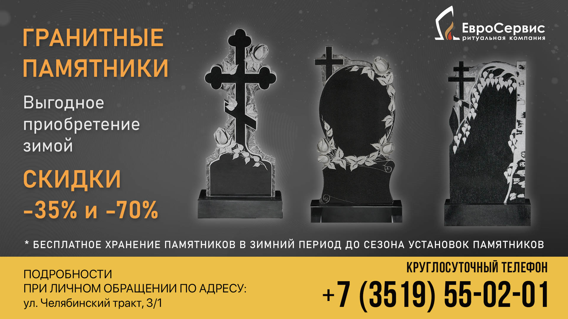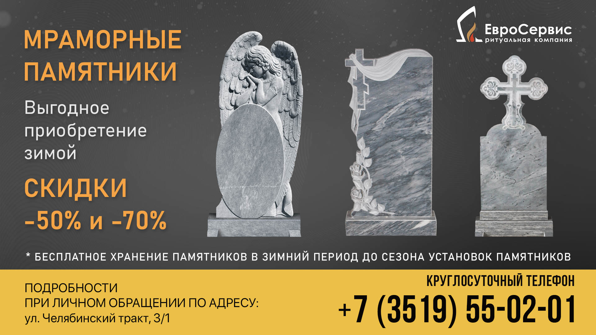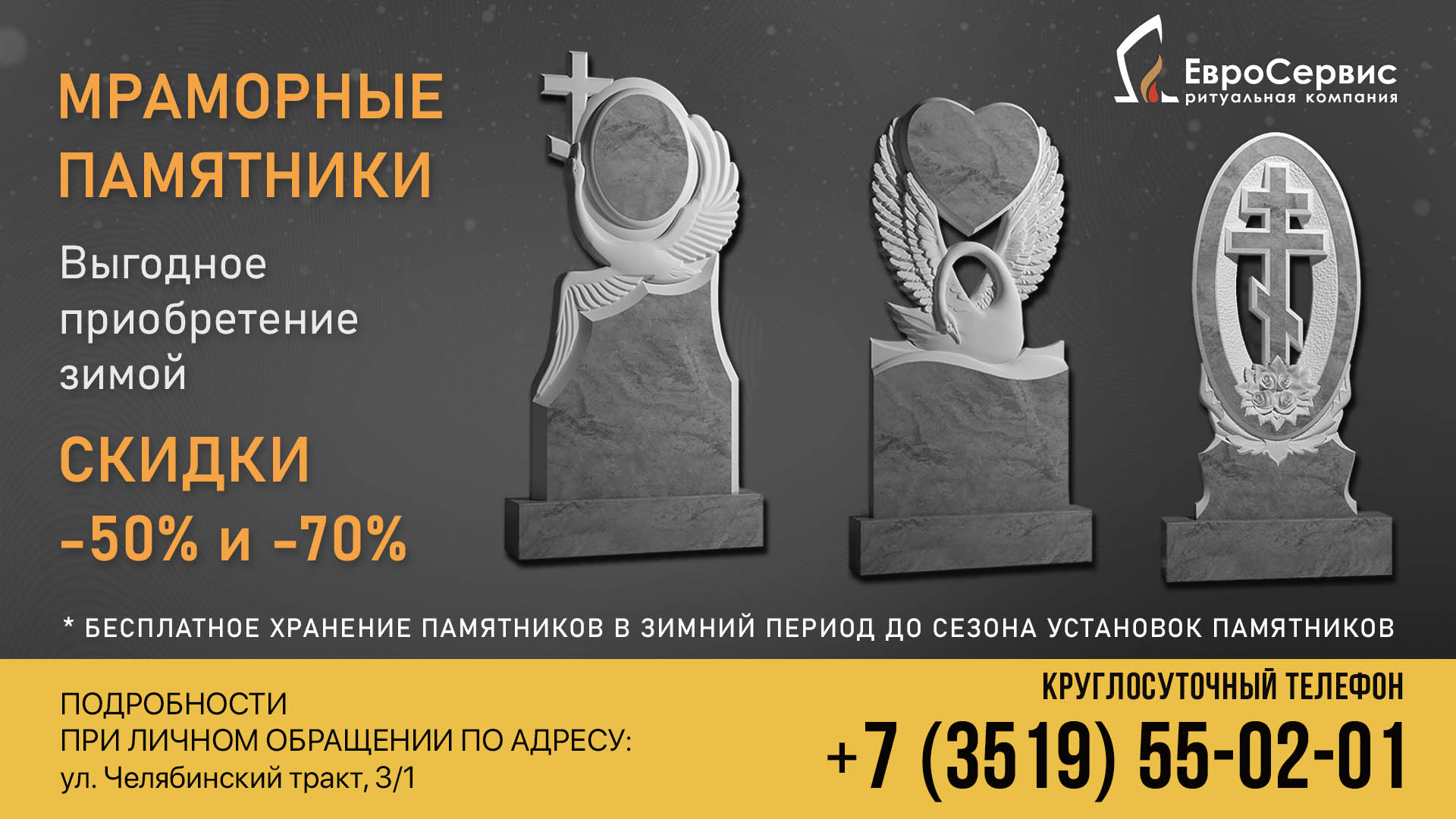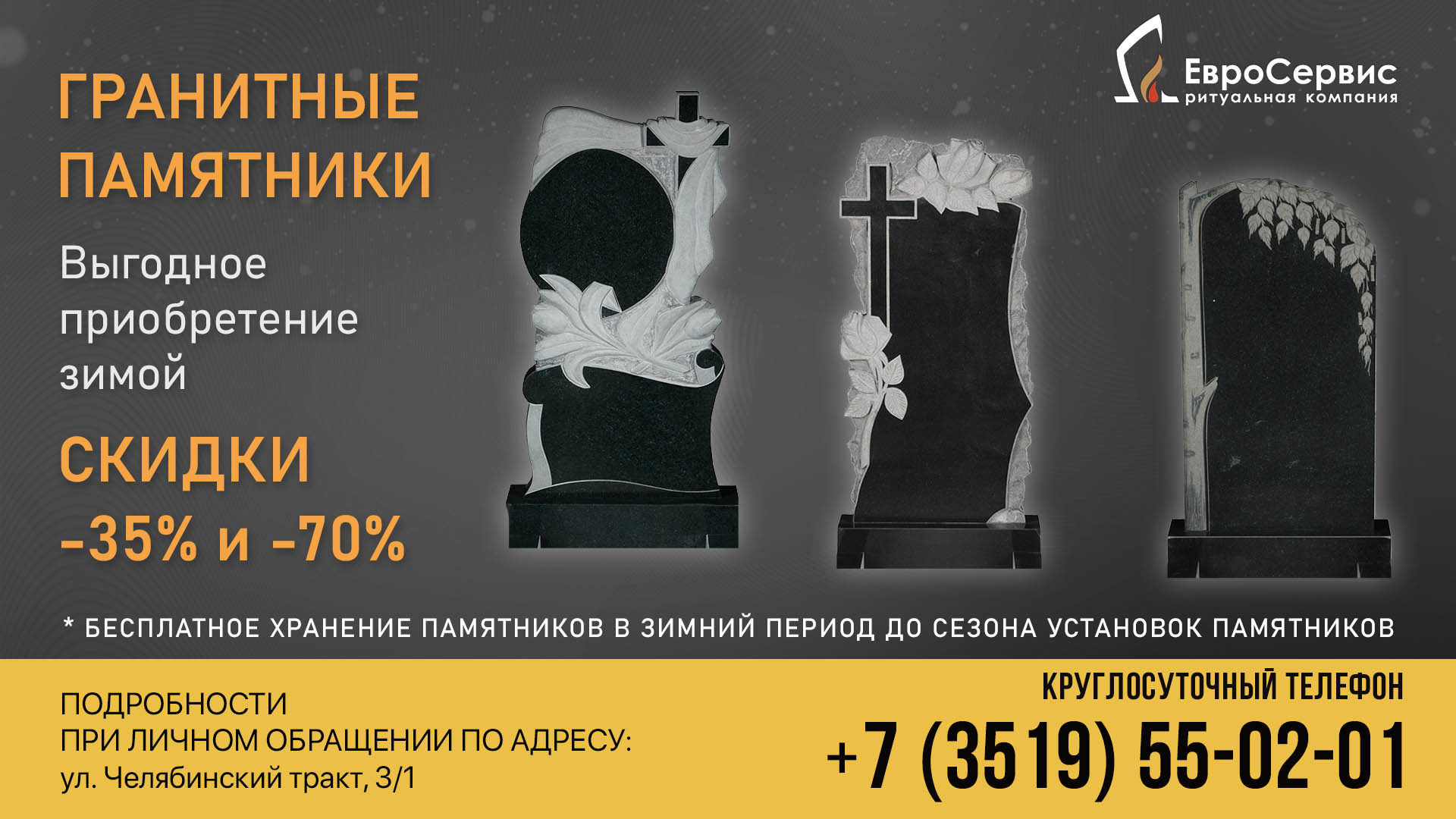 Заказать памятник можно по адресу Челябинский тракт 3/1, где сотрудники покажут все имеющееся разнообразие изделий, или позвонить по телефону +7 (3519) 55-02-01, или написать в чат сайта компании (evroservis.ooo).