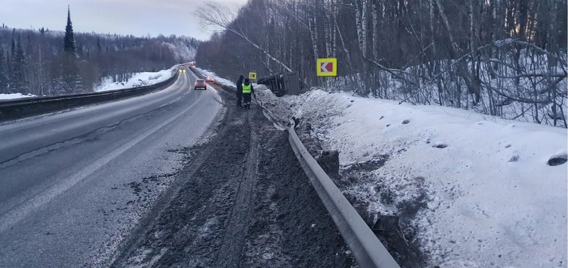 На трассе в Челябинской области грузовик съехал с дороги и опрокинулся