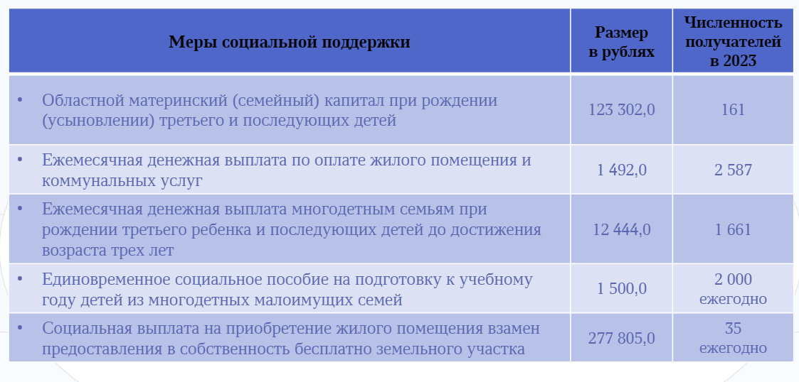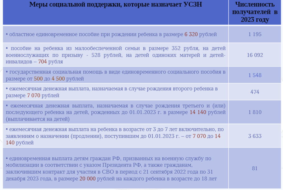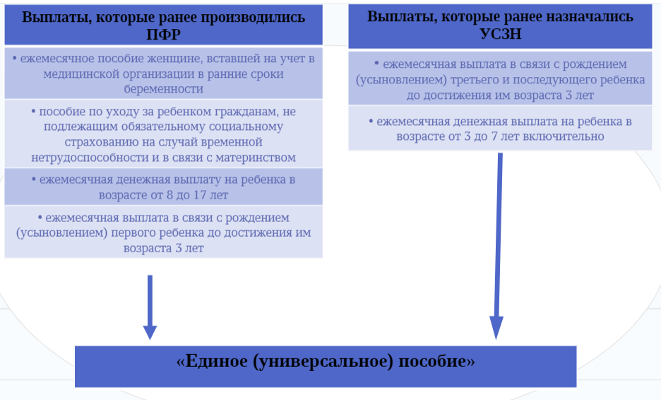 В 2023 году изменился подход к предоставлению мер социальной поддержки семьям с детьми. С 1 января установлено ежемесячное пособие в связи с рождением и воспитанием ребенка (так называемое «Единое или универсальное пособие»). Новое пособие объединило ряд действующих ранее мер поддержки малообеспеченных семей, как федеральных, так и региональных.
