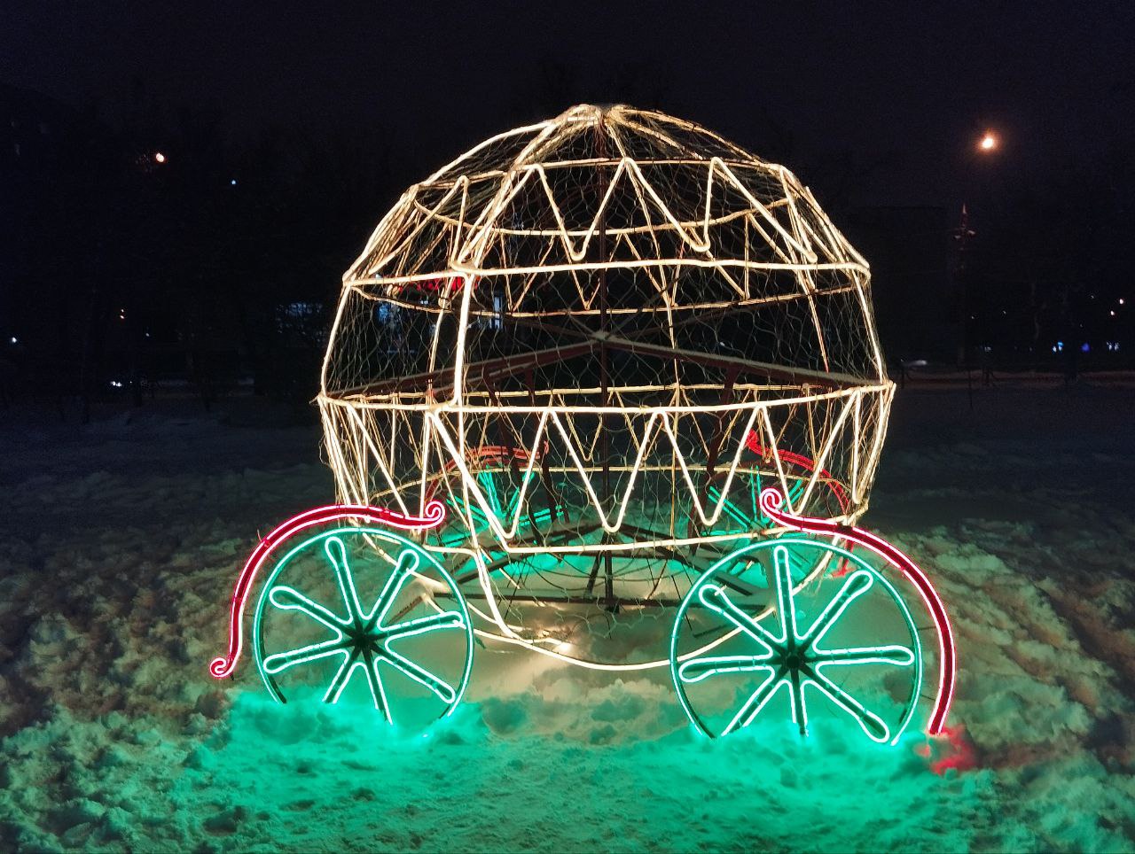 Другую — небольшой горкой — украшают лебеди.Появилась светодиодная композиция — карета.